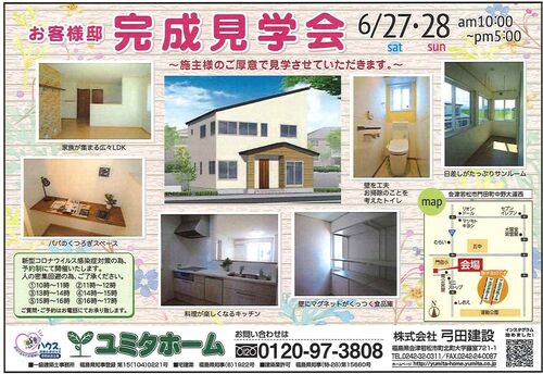 6月27・28日(土・日)に会津若松市門田町にて戸建新築住宅(ユミタホーム)の完成見学会を開催します。 新型コロナウィルス感染症対策のため、予約制にて開催いたします。 密集回避のため、ご協力をよろしくお願いします。 ご質問・ご予約はお電話 012…