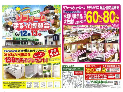 6/12・13日(土・日)の2日間、ユミタホームでは、リフォームまるっと博覧会をすまいの広場にて開催いたします。 ☆おすすめ⇒Panasonic水廻り5点セットを特別価格にてプレゼント! ☆水廻り展示品の限定販売もまだございます。 水廻り交換・増改築工事…