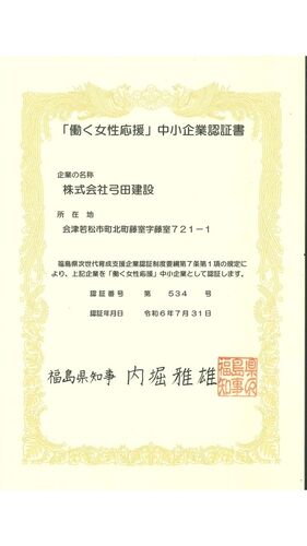令和6年9月5日(木)に福島県次世代育成支援企業認定制度認証書交付式が開催されました。 弊社は 「働く女性応援」中小企業認証 を取得いたしました。 今後も発展と地域社会のために、励んで参ります。